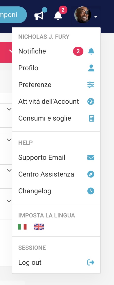 Cliccando sulla tua immagine del profilo presente in alto a destra, potrai visualizzare il menù delle impostazioni dell’account: