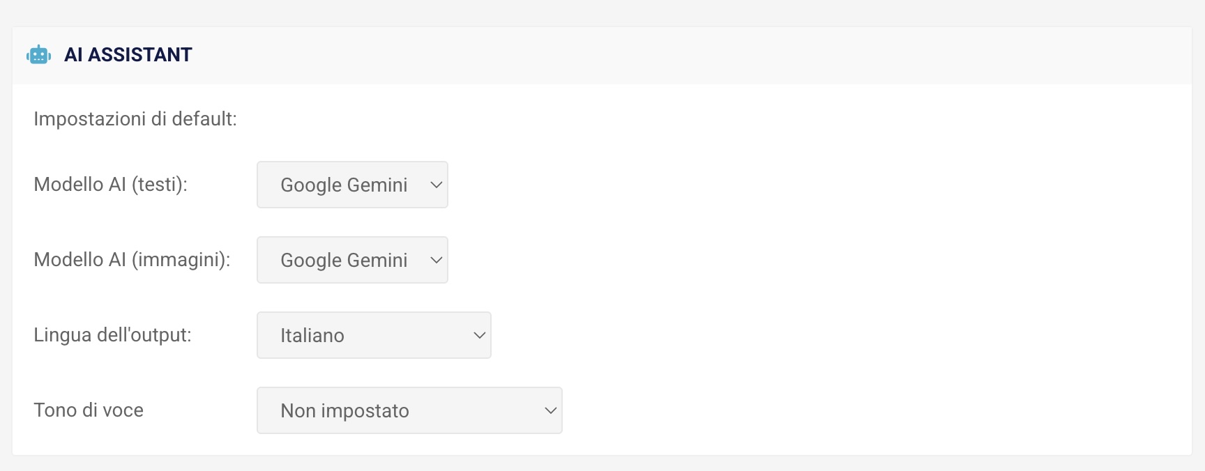 - le impostazioni di default dell’AI Assistant