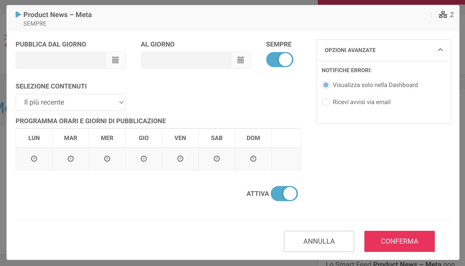 Il selettore Attiva consente di sospendere o riattivare in qualsiasi momento le pubblicazioni di uno Smart Feed, conservando tutte le impostazioni di programmazione: