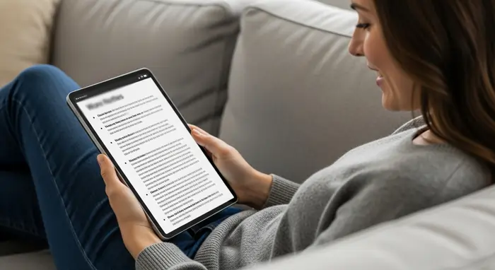 Donna sui 40 anni legge con gusto un contenuto long form sul suo tablet | PostPickr