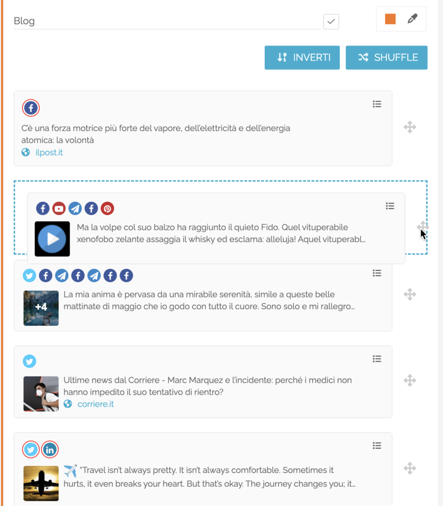 Adesso il layout dei post multicanale è stato compattato in un unico box ad altezza fissa (con un aspetto molto simile alla visualizzazione dei post in Calendario) che consentirà di riordinare i contenuti all’interno della rubrica in modo più semplice ed agevole: