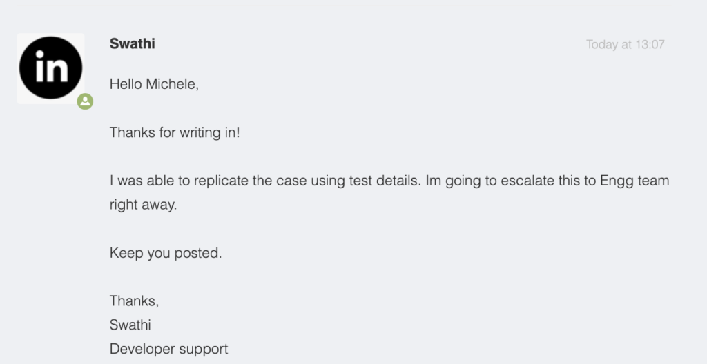 Parallelamente, dopo la nostra segnalazione, anche il team di LinkedIn ha avviato indagini interne e individuato la causa dell’anomalia legata a problematiche interne alla loro piattaforma API.