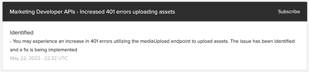 Come riportato sulla loro API Developer Status Page, il bug sembrerebbe dovuto all’insorgere di errori di tipo 401 sullo stesso endpoint API mediaUpload: