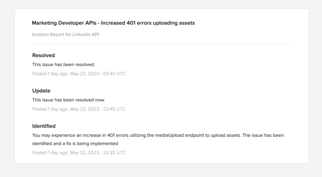 Come riportato anche nel forum dei developer LinkedIn, il bug sulla piattaforma API è stato definitivamente risolto e la problematica rientrata: