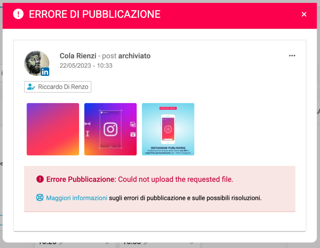 Alcuni utenti hanno riscontrato l’errore di pubblicazione “Could not upload the requested file.” per i post contenenti immagini singole o multifoto destinati a Canali LinkedIn (profili personali e pagine aziendali).